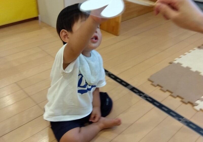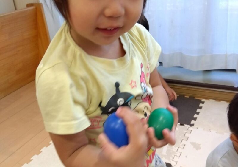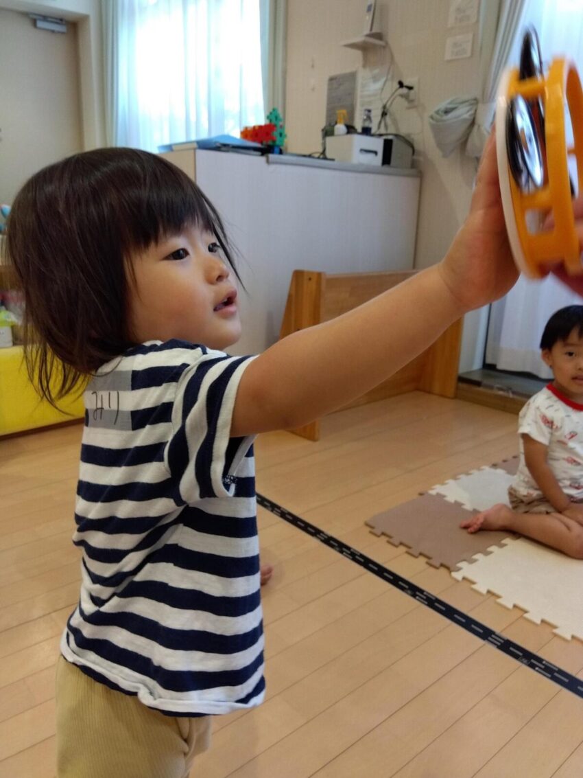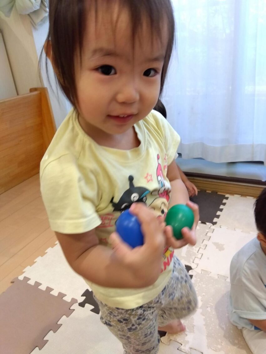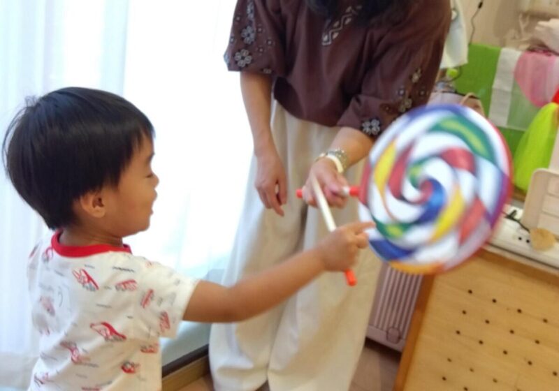 先生のピアノに合わせてカラフルなマラカスを振って音を出したり、スカーフなどカラフルな小道具が登場すると目をキラキラさせて夢中で楽しんでいました。