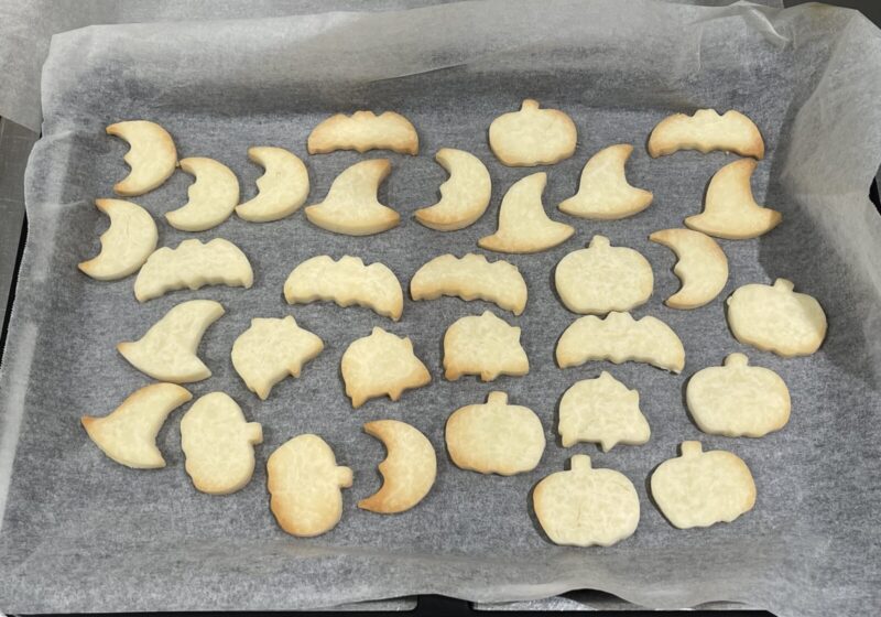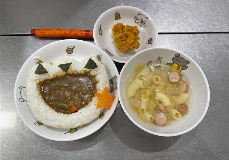 ハロウィン給食 2025.11.07 10月31日の給食はハロウィンメニューでした。 ・ハロウィンカレー ・かぼちゃのサラダ ・マカロニスープ ・魚肉ソーセージ ジャックオーランタンに見立てたカレーを作りました。目と鼻はかぼちゃの皮で表現しました。 見た目から子ども達は楽しく、美味しそうに食べていました。 おやつのクッキーはハロウィン仕様に型抜きをしました。「これは何の形だろう?」と考えながら食べる姿が微笑ましかったです。 これからも季節の行事を楽しめる給食・おやつを提供していきたいと思います!